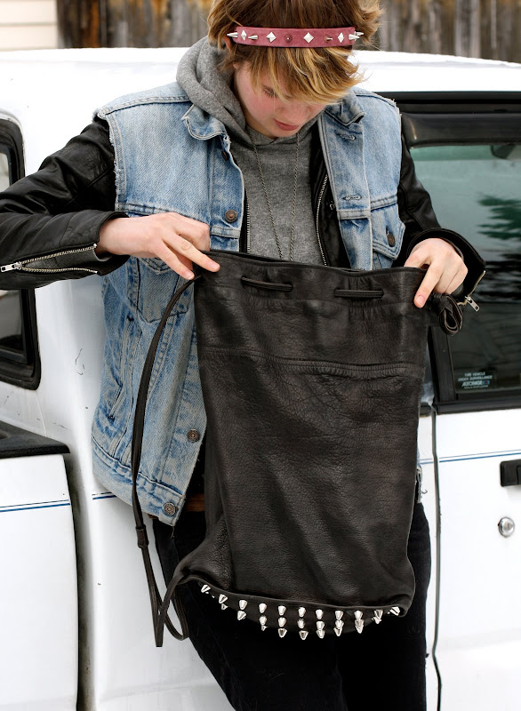 The leather bag was a DIY i finished a little while ago . . . The bag was originally a dirty grey color(with some gnarly stains), so i dyed it black with leather dye and added the conical spikes to the underside. It's quickly turned into my favorite bag.